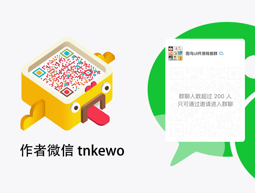 如需协助解决bug、拓展人脉等,可添加作者微信进微信群,因为图鸟生态成员主要在微信群活跃